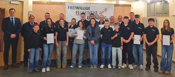 . Über steigende Mitgliederzahlen wurden die Gäste der jährlichen Jahreshauptversammlung des Feuerwehrvereins im Naumburger Stadtteil Elbenberg informiert. Während in der Einsatzabteilung die Mitglieder schwinden, 19 Einsatzkräfte versehen aktuell in Elbenberg ihren Dienst, steigt die Zahl der fördernden Mitglieder im Feuerwehrverein seit Jahren stetig an, sodass die Liste im Kassenbuch von Kassiererin Nina Schulzke 271 Einträge aufweist. Mit den Jahresberichten von stellv. Wehrführer und Schriftführer Niklas Röhrig, Jugendwart Luis Gonsior und Kinderfeuerwehrwart Valentin-Zimmer-Wild konnten sich die Zuhörer einen Überblick über die vielfältigen Aktivitäten des vergangenen Jahres verschaffen. Die Einsatzabteilung leistete knapp 1700 Stunden Aus- und Fortbildung und wurde zu 20 Einsätzen gerufen, darunter mehrere Einsätze aufgrund von Starkregen in Elbenberg und Brände in Altendorf und Naumburg. Der Feuerwehrverein trug mit seinen Veranstaltungen Osterfeuer, Familienwandertag und Grünkohlessen merklich zum Elbenberger Dorfleben bei und unterstützte mit verschiedenen kleineren Anschaffungen die Arbeit der Einsatzabteilung. Höhepunkt der Jugendfeuerwehr war neben der gemeinsamen 24-Stunden-Übung mit den Jugendfeuerwehren aus Altendorf und Heimarshausen die Teilnahme am Bundeswettbewerb und die Abnahme der Leistungsspange, der höchsten Auszeichnung der deutschen Jugendfeuerwehr. Unzählige Stunden Aus- und Fortbildung, Spiel und Spass sowie Erfolge bei den Knotenwettkämpfen auf Stadt- und Kreisebene rundeten das Jahr der Jugendlichen ab, die mittlerweile 19 Mitglieder in ihren Reihen zählen können. Die ebenfalls 19-köpfige Kinderfeuerwehr konnte ihr früh erworbenes Feuerwehrwissen gepaart mit Geschicklichkeit bei einer Mini-Olympiade des Feuerwehrverbandes der Feuerwehren des Wolfhager Landes in Bad Emstal und bei mehreren „Tatze“-Prüfungen unter Beweis stellen. Bürgermeister Sebastian Lesch bedankte sich für die gute Zusammenarbeit und den Einsatz der Ehrenamtlichen zum Wohle der Gemeinschaft. Gemeinsam mit Stadtbrandinspektor Thomas Heger und Maximilian Strube vom Verband der Feuerwehren des Wolfhager Landes rundeten Ehrungen und Beförderungen die Veranstaltung ab. Hervorzuheben ist die würdige Ehrung des im Dezember plötzlich verstorbenen Wehrführers Patrick Albrecht, der posthum das silberne Brandschutzehrenzeichen am Bande für 25 Jahre aktiven Dienst in der freiwilligen Feuerwehr erhielt. Für Freitag, den 06. Februar lädt der 1. Vorsitzende der Freiwilligen Feuerwehr Elbenberg e.V., Kevin Lesch, zum traditionellen Neujahrsempfang in das Feuerwehrhaus, Balhorner Straße 6, herzlich ein. Beginn ist um 19:00 Uhr. Bei guten Gesprächen und einer rustikalen Brotzeit besteht Gelegenheit zum Austausch.
